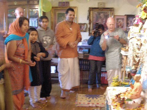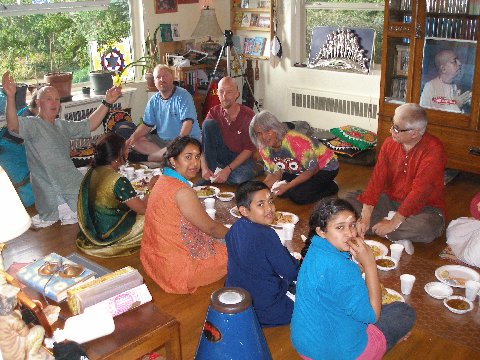Glories to Srila Prabhupada Below is a pictorial and video record of the festival which we here in Sedro Woolley Wa USA just observed on Sunday Aug 29th, 2010 We held this event on Sunday so that all the local devotees could attend and celebrate the Divine Appearance of the Lord 5000 years ago as well as honor the appearance of His pure devotee, AC Bhaktivedanta Swami Srila Prabhupada. Later this week in our own ashrams we all will observe the actual date. We offered over 108 different preparations here which included 70 kinds of burfy, Gulab Jamuns, Sweet Rice,2 kinds of apple chutney, tomato chutney bean pate, paella, cream of tomato soup, turnip pasta, zucchini /turnip/cabbage pilaf, roasted vegetables, summer squash/kofta casserole, saurekraut, 16 kinds of dried fruit, 12 kinds of fresh fruits , garden pasta, rice, and coleslaw.And more..... The devotees who came very heartedly took part in the many kirtans which ensued throughout the program. Lots of dancing even for a bunch of old timers like most of us who managed to keep up a steady drum beat which kept the feet all leaping off the temple room floor. We gave class on the BG verse "Janma karma ca me divyam.." and then read parts of a lecture by Srila Prabhupada who explained that "knowing "Krsna meant- to come to the Brahma bhuta platform first and then by constantly engaged in Devotional Service, as this was the only way to know Krsna in fact. Sentimental understanding like Krsna appeared in Mathura, killed Kamsa, etc is OK for those who say "Yes,Yes, I know Krsna", but will not guarantee ones transfer back to Home back to Godhead.One has to know Krsna in fact starting with knowing (with conviction) one is not that material body. All glories to His Divine Grace Srila Prabhupada who is taking us all back to Godhead.