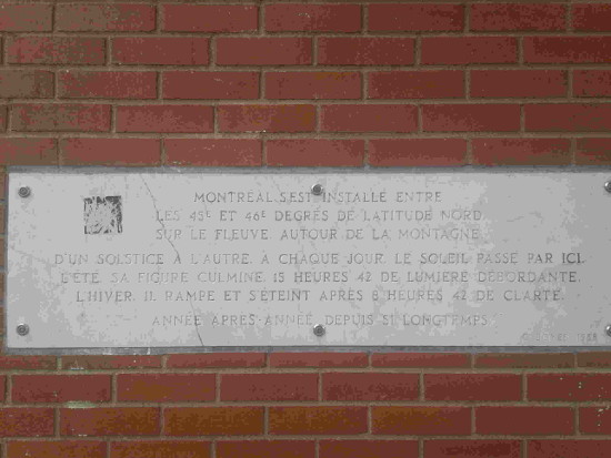 Pas très loin de chez moi il y a cet écriteau sur le mur d'une ancienne église. J'ai passé des centaines de fois devant celle-ci et je n'avais jamais remarqué cet écriteau. Vous ne voyez peut être pas bien mais il est écrit: "Montréal s'est installé entre les 45 e et 46 e degrés de l'altitude nord sur le fleuve autour de la montagne. D'un solstice à l'autre chaque jour le soleil passe par ici. L'été sa figure culmine 15 heures 42 de lumière débordante. L'hiver il rampe et s'éteint après 8 heures 42 de clarté année après année depuis si longtemps."