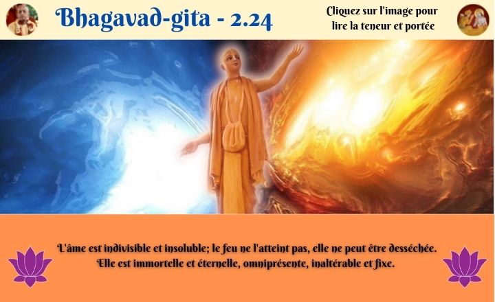 De même qu'on ne peut éteindre un brasier en l'arrosant continuellement de ghi, nous ne pouvons trouver la satisfaction en multipliant nos projets en vue des plaisirs des sens. Le brasier, c'est celui de l'existence matérielle -bhava-maha-davagni. Ce feu se déclare de lui-même, sans qu'aucun effort soit fait dans ce sens. Nous désirons trouver le bonheur dans l'univers matériel, mais jamais cela ne sera possible; nous ne parviendrons ainsi qu'à alimenter le brasier de nos désirs. Ceux-ci ne peuvent être satisfaits par des projets ou des pensées illusoires. Nous devons plutôt suivre les instructions de Sri Krsna: sarva-dharman parityajya mam ekam saranam vraja. Nous serons alors heureux. Sinon, sous prétexte de poursuivre le bonheur, nous continuerons à endurer des conditions misérables.